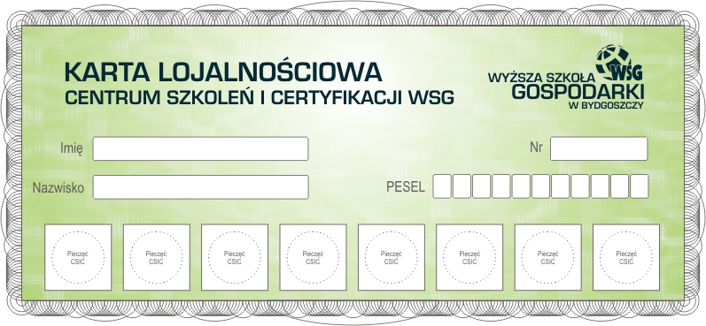 Uczestnicząc w naszych kursach bierzesz udział w Programie Lojalnościowym Centrum Szkoleń i Certyfikacji. Istotą pogramu, który stworzyliśmy specjalnie dla Ciebie jest gromadzenie punktów - pieczątek, które zaczynasz zbierać już po podpisaniu pierwszej umowy na kursie. Otrzymujesz przy tym Kartę Bonusową z indywidualnym numerem, która oprócz gromadzenia punktów daje Tobie możliwość korzystania ze wszystkich zniżek oferowanych także przez partnerów WSG. Karta bonusowa jest ważna 2 lata od pierwszego skorzystania z karty.